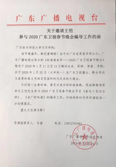 近日,公司艺术公司王恺老师受邀参加由中共广东省委宣传部主办,广东广播电视台承办的《岭南春来早——2020广东卫视春节晚会》导演组的编导工作。晚会将于2020年1月25日(大年初一)在广东卫视播出。