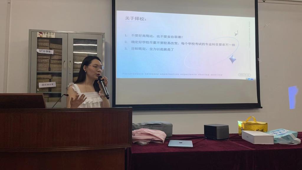 今年毕业于18环境4班的黄雅昕,考上了广州美院的会展设计专业,她分享了为什么要考研、文化科目如何备考、专业科目如何备考、备考过程中需要注意什么,让同学们对考研有了进一步的认识。