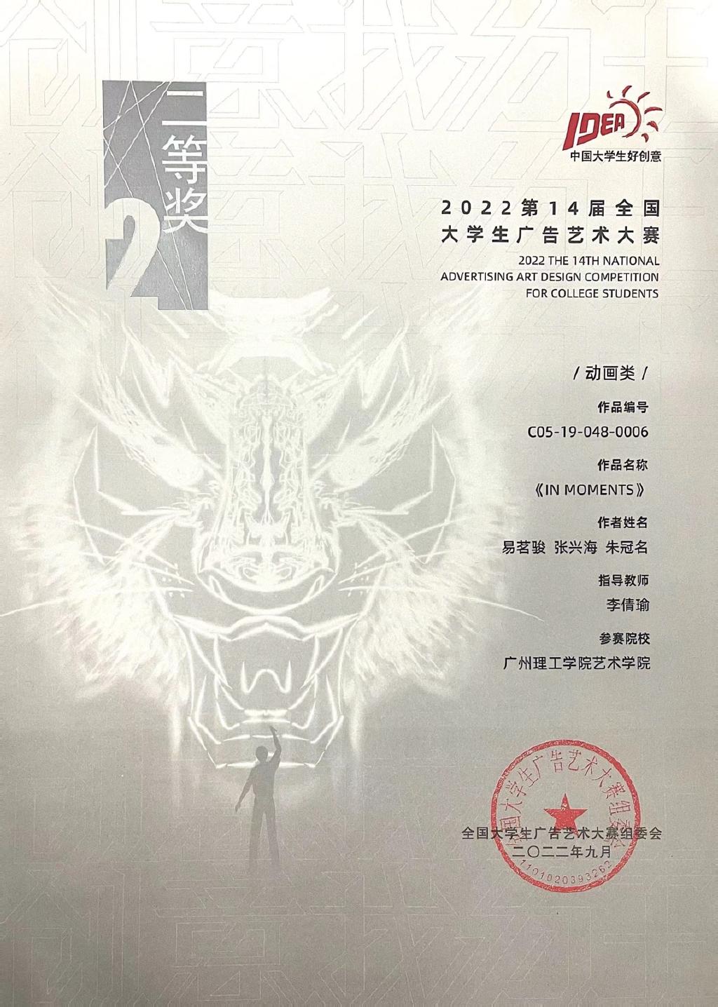近日,第14届全国老员工广告大赛降下帷幕。由bevictor伟德李倩瑜老师指导,员工易茗骏、张兴海、朱冠名三名同学制作的动画作品《IN MOMENTS》荣获全国“即时设计”动画类赛题二等奖,并选入第14届大广赛学科竞赛成果展示云盛典。