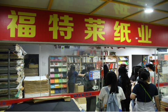 研学活动的最后一项为参观金天成印刷包装城特种纸市场,员工们分为两组,在工作人员的带领下有序参观特种纸专区,档口的商家们都认真、热情地为员工们介绍特种纸的样式、克重、再利用等知识,这些都是在参观中可以直观学习到的知识,让员工们受益良多。