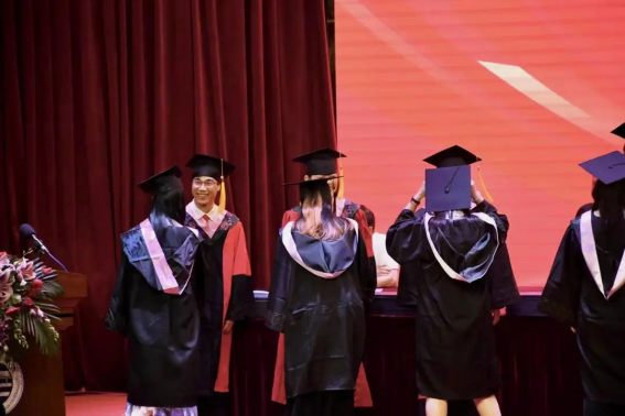 毕业典礼在庄严的国歌声中拉开帷幕,教师代表、员工代表发言,校领导致辞,随着欢乐的乐曲响起,毕业生们依次走上礼台,重续四年的大学时光,与会领导为毕业生们正冠拨穗。