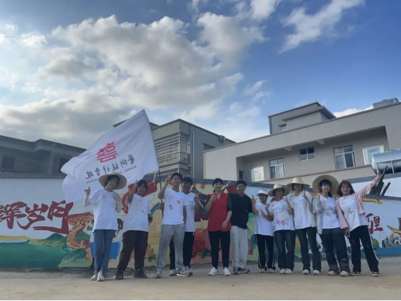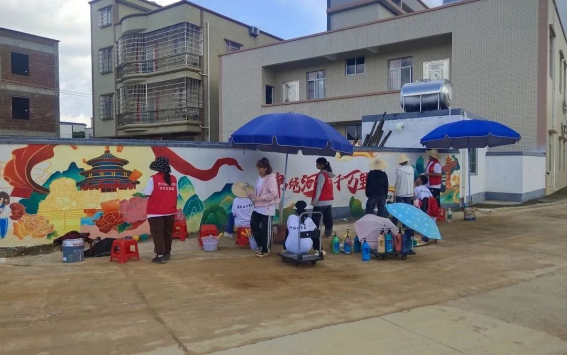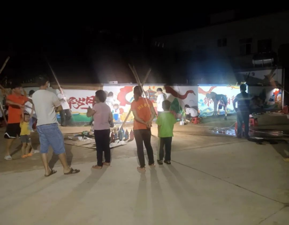 云顶千舟艺术实践团所选墙绘地点距“兴旺农业”一公里,为了节省时间用来画画,经常选两位同学帮团队取餐,大家一起在村民庭院就餐,村民给团队提供凳子方便就餐。为了赶时间,团队最晚到凌晨一点多收工。绘画中,偶尔有黄牛经过,不时有村民过来围观,在沙田仔制作墙绘的另一支队伍“优雅乡村行”,还在队长杨芷涵的带领下过来参观交流,大家互动友好,“红星火”团队成员也与云顶千舟艺术实践团进行了合影。