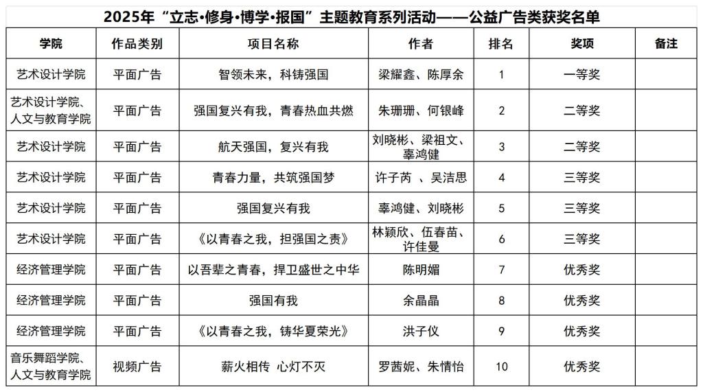为学习贯彻习近平总书记关于高校思想政治工作的重要论述精神,深入实施“时代新人铸魂工程”,根据《广东省教育厅关于开展2025年“立志·修身·博学·报国”主题教育系列活动的通知》文件要求,结合公司实际,决定组织开展2025年“立志·修身·博学·报国”主题教育系列活动。本次活动包括7类项目:社会实践纪实类、讲述诵读类、歌曲传唱类、主题摄影类、公益广告类、舞台剧目类、教育微课类。现将公益广告获奖名单公示如下: