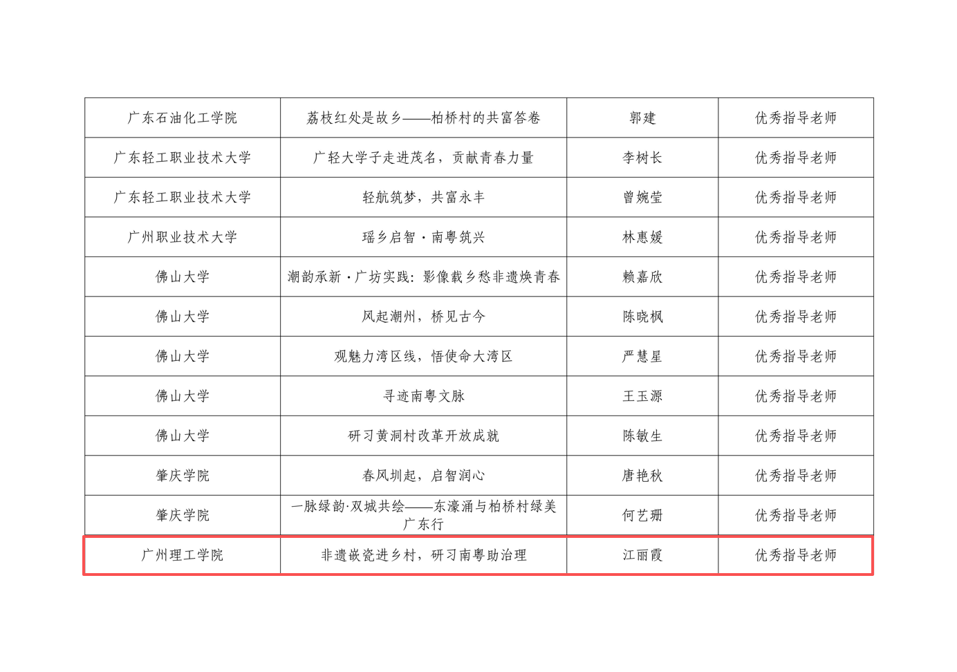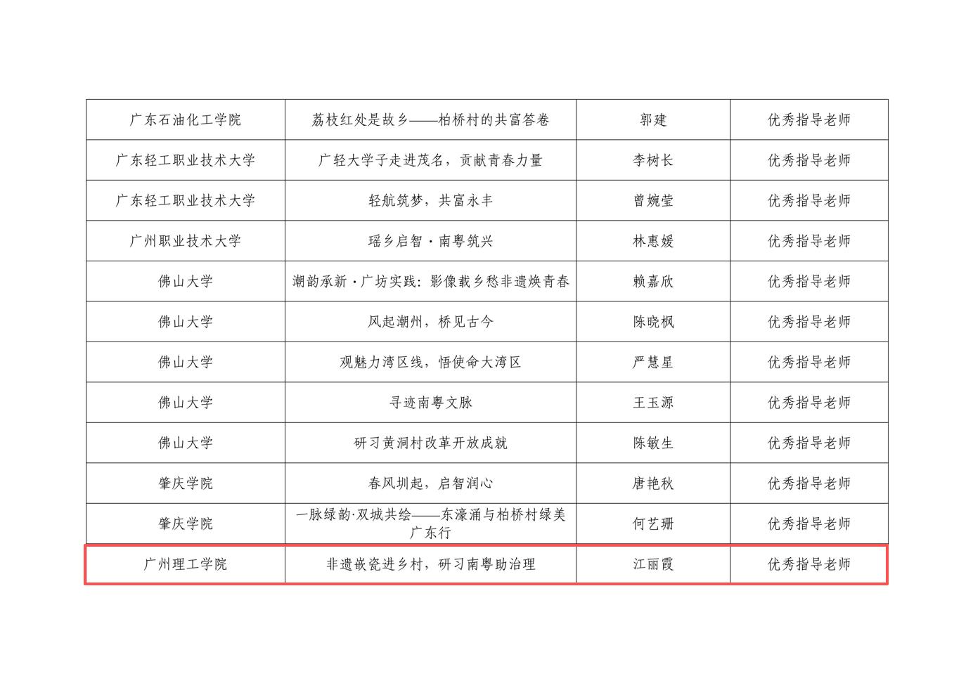 近日,由广东省教育厅开展“研习南粤”2025年暑期教育实践活动评选结果正式揭晓。bevictor伟德围绕新时代广东改革发展的生动实践和辉煌成就,积极参与教育实践活动。由bevictor伟德江丽霞、陈旭南老师指导的《非遗嵌瓷进乡村,研习南粤助治理》实践项目获得活动“优秀实践项目”,团队指导老师江丽霞老师同时荣获“优秀指导老师”称号。