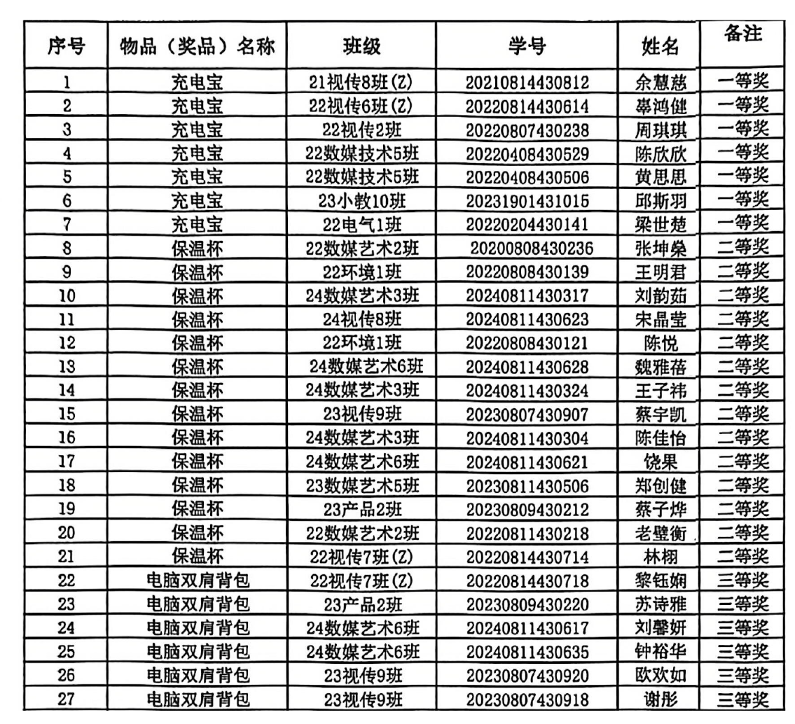 目前,校级选拔赛的评审工作已顺利完成。获奖名单如下。请所有获奖同学前往7栋教学楼204室领取奖品。