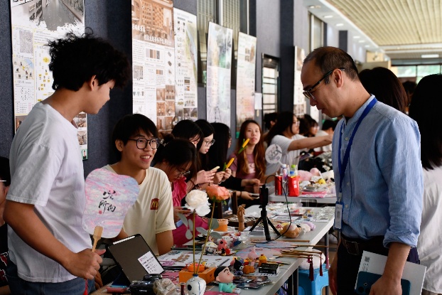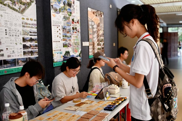 活动现场设置的多种体验区掀起参与热潮。"漆扇"区排起长龙,师生们执笔点染,将春意定格于绢面;"扎染工坊"里,艺术学子化身非遗传承人,手把手教授传统技艺吸引众多科技爱好者驻足体验。