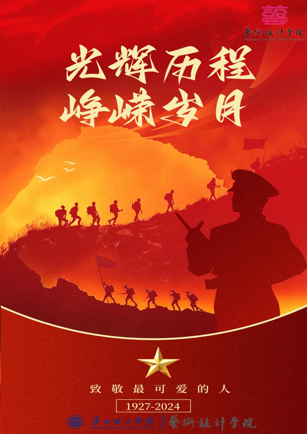设计理念:主题“光辉历程,峥嵘岁月”,红色主色调彰显革命赤诚。背景融先辈跋涉剪影、领路者形象,缀金色五星与旗帜,1927-2024锚定岁月跨度,致敬先辈热血,赓续红色血脉砥砺前行。
