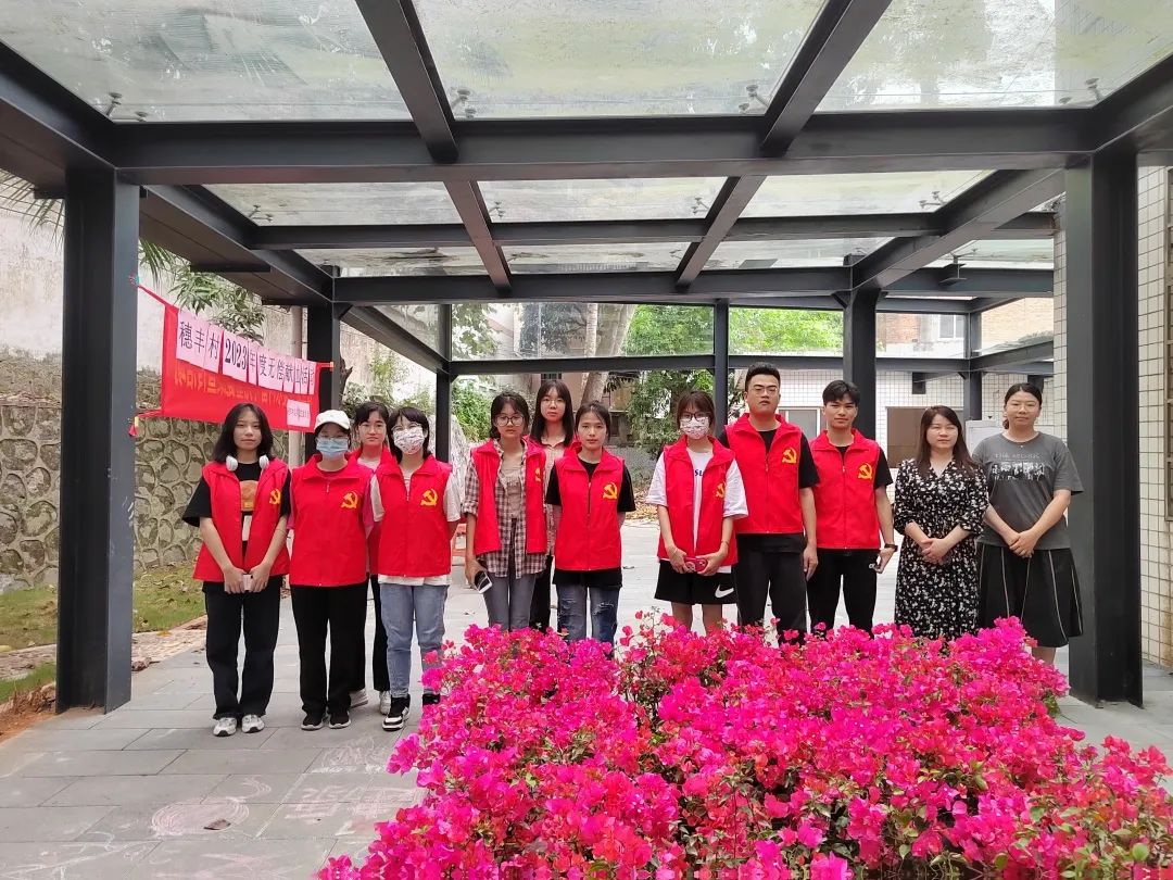 历经一个多小时劳作,大家齐心协力将穗丰村社区插满鲜花,社区里焕然一新,志愿者们和社区工作人员一同拍摄了合照。他们红色的服装在阳光照射下格外鲜亮,展现广理学子的优秀风采。