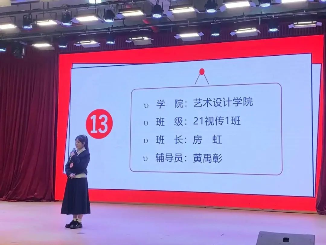 21视传1班甘于奉献、踔厉奋发。班长房虹的演讲展现了班级同学勇争第一,精益求精的精神风貌,展现了同学们应有的情怀与担当,体现了有理想、有担当的青年形象。