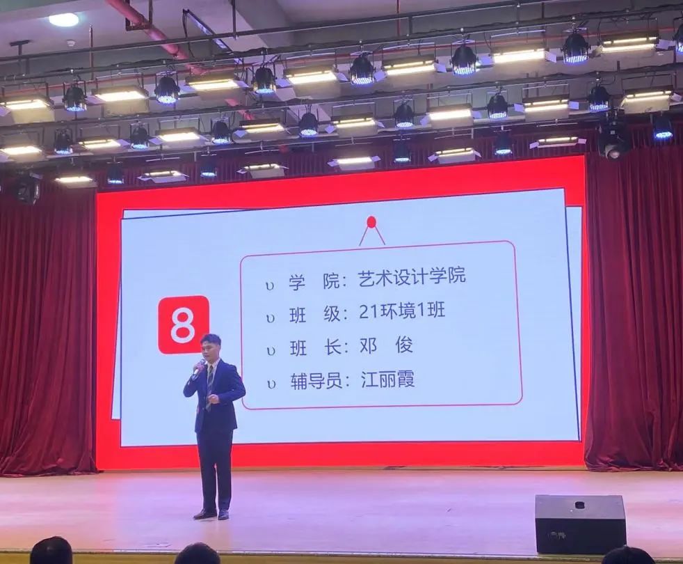 在汇报展示环节中,班长结合本班专业学习、社会实践、科研创新和文体活动方面内容,以视频展播、情景演出、作品展示形式展示班级建设的成果。