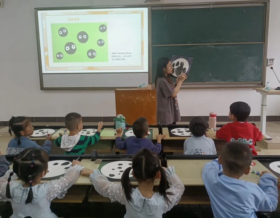 绘画小班本期课程是《煤球小精灵》,小老师首先播放了《千与千寻》的动画片段,让小朋友们了解小煤球这种神奇的小生物,以此激发小朋友的绘画兴趣;接着通过观察煤球君的形态特征及生活环境来提高小朋友的造型与表现能力;最后运用水粉拓印的方法表现小煤球的外形,用勾线笔为小煤球绘画毛发丰富细节,同时增添趣味特征。