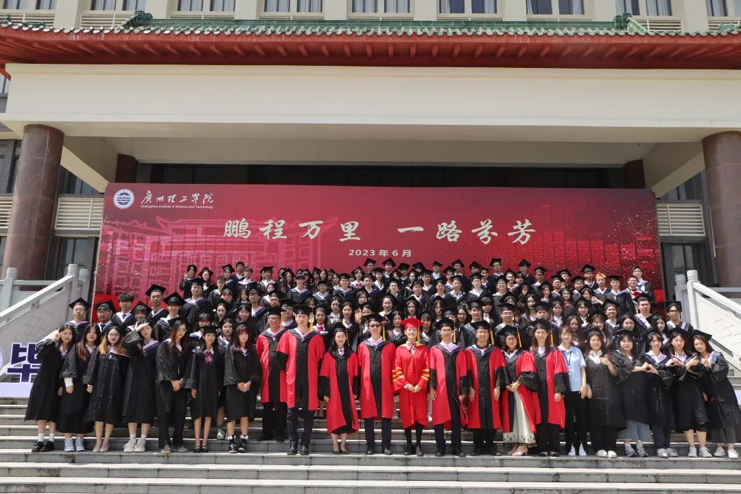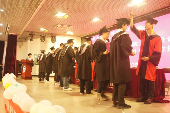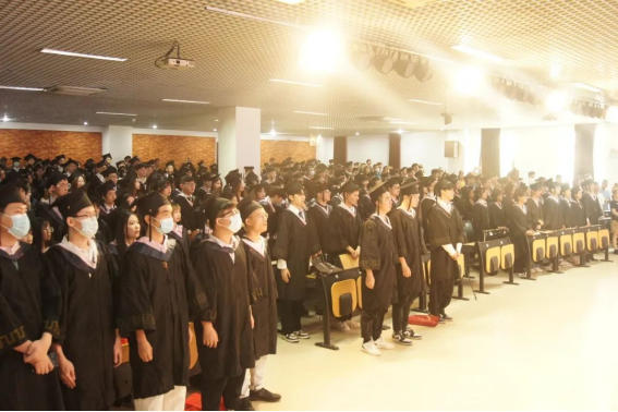 在领导、老师和现场家长的见证下,2023届毕业生们分组上台完成拨穗正冠授位仪式。