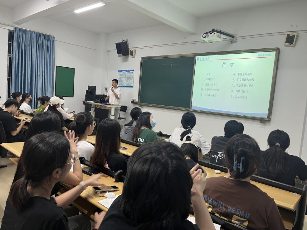 随后,班导师们就毕业要求和毕业论文规范进行了详细解答。从毕业论文的选题、开题报告撰写、文献综述、研究方法、实验设计与实施、数据分析与结果呈现、结论与讨论等多个方面进行了详细讲解,通过结合具体案例,深入浅出地分析了每个环节的注意事项和常见问题,为同学们提供了宝贵的指导和建议。此外,班导师们还对论文格式规范进行了详细讲解,强调了论文标题、摘要、关键词、目录、正文、参考文献等部分的撰写要求和注意事项,帮助同学们明确了论文撰写的标准和规范。