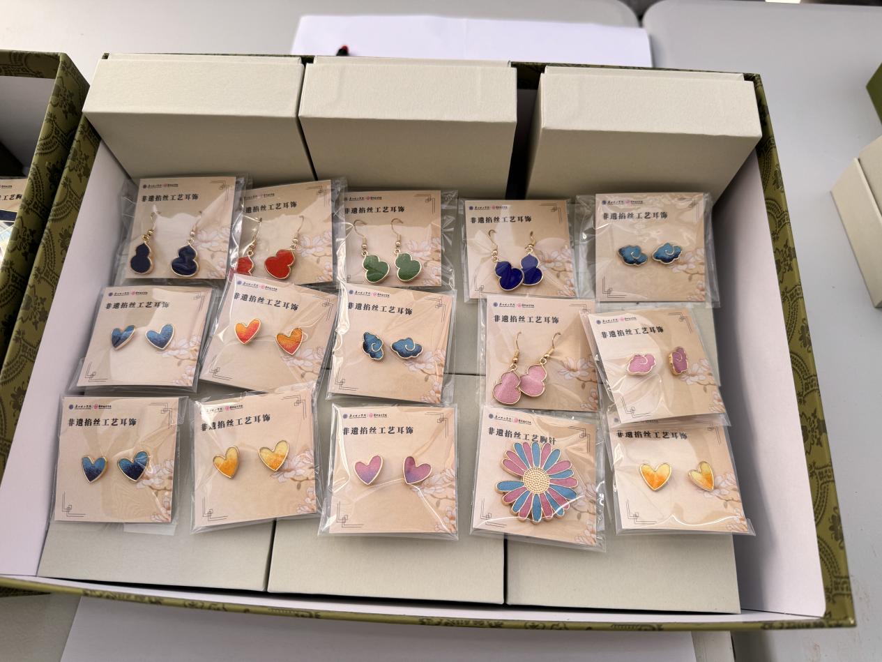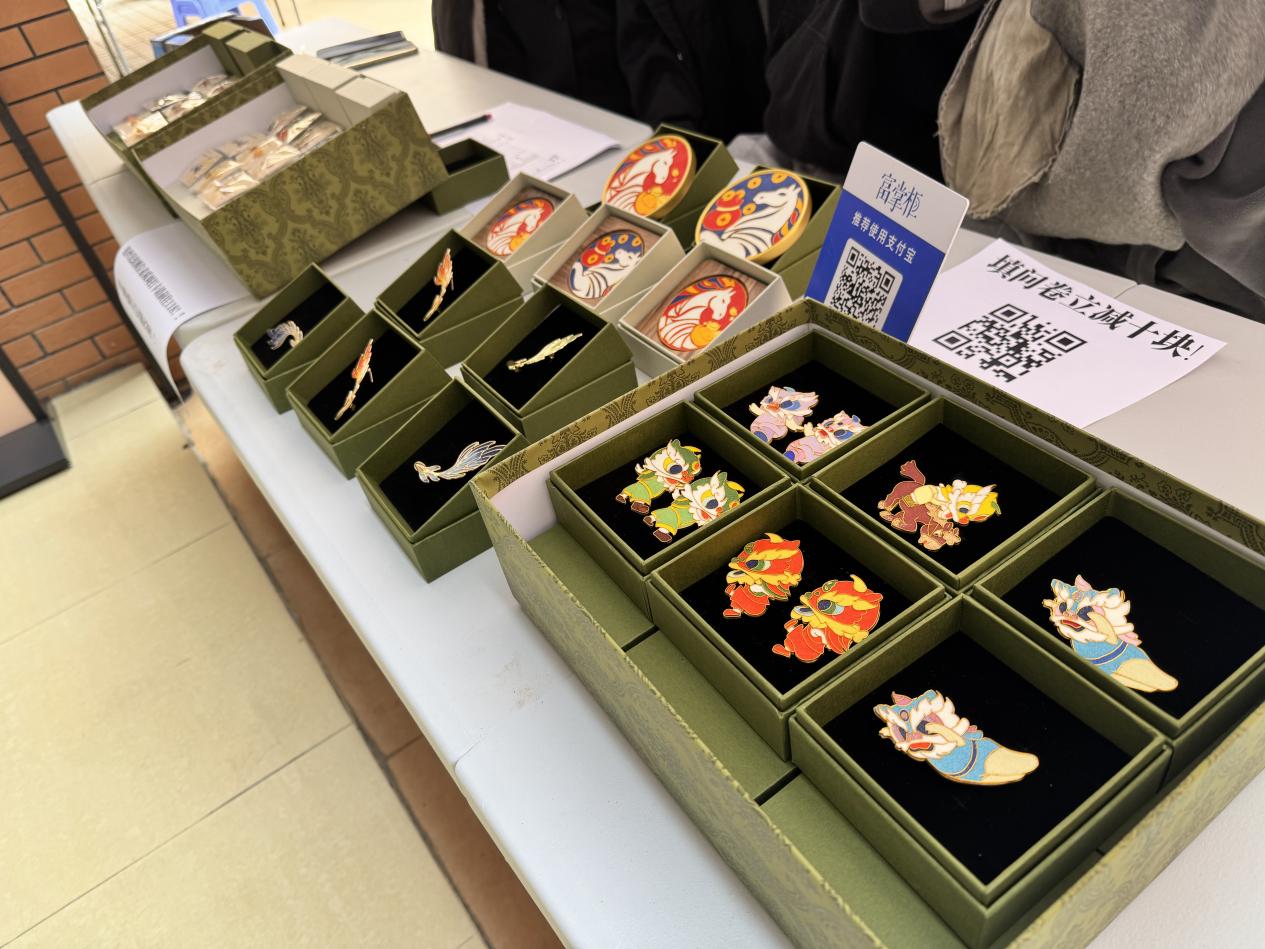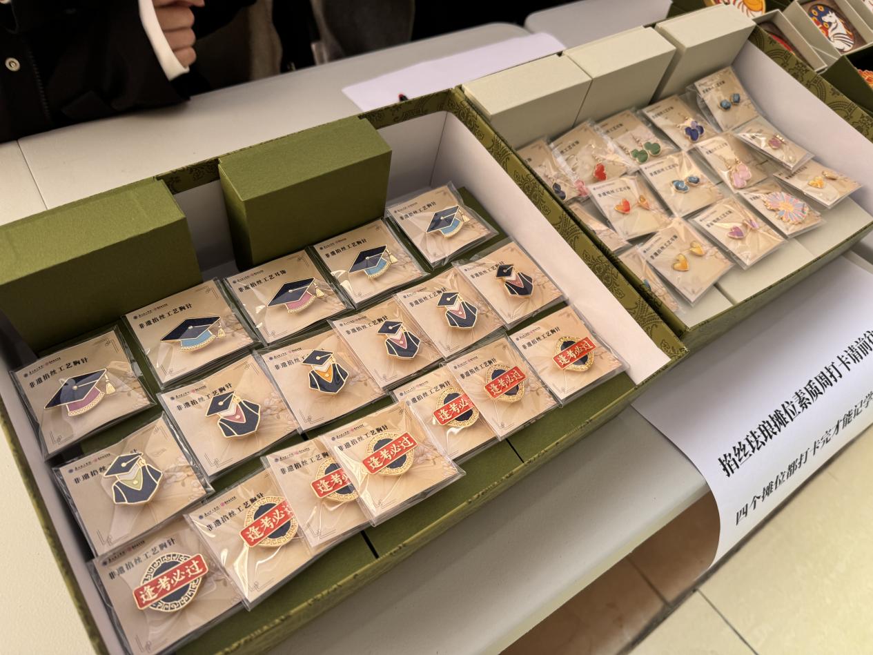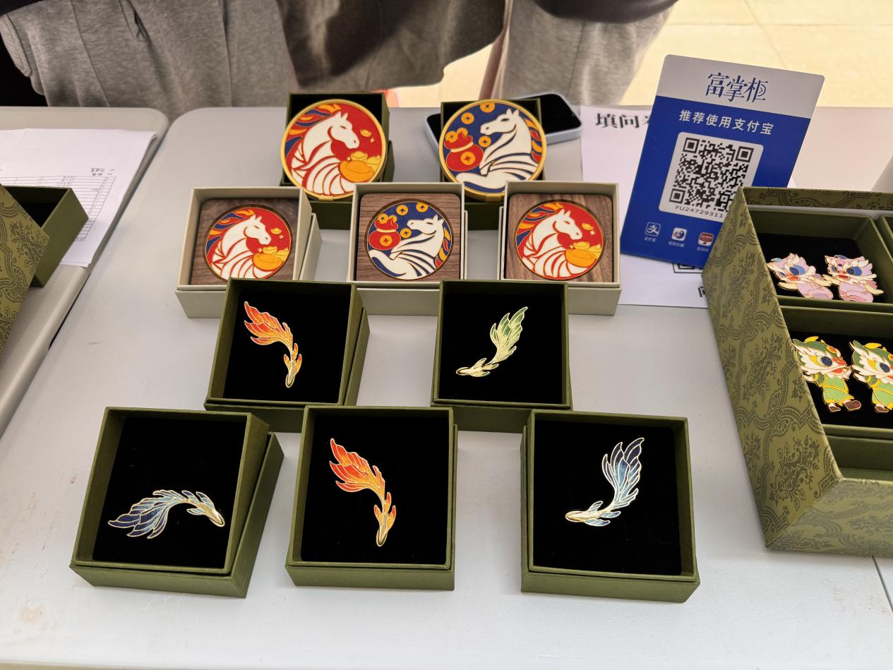 活动现场,珐琅工艺工作室摊位前人头攒动,精心陈列的文创产品成为校园里一道亮眼的风景线。小巧精致的珐琅小雏菊耳钉以清新配色还原花卉灵动姿态,心形耳钉凭借简约浪漫的设计戳中年轻学子审美,葫芦耳钉则将传统吉祥寓意与时尚元素巧妙融合,三款耳钉系列凭借独特的工艺质感和百搭属性,成为现场最受欢迎的爆款单品,开售不久便屡屡补货。而充满场景化设计的文创产品同样热度不减:校园主题类中,“逢考必过” 胸针以鲜明的文字设计搭配珐琅饱满的色彩张力,成为备考学子的 “幸运符”,学士帽胸针则精准契合毕业季氛围,承载着青春纪念意义;特色主题类里,全运会 “劲当当” 磁吸胸针巧妙融入运动元素与赛事精神,珐琅的光泽让运动形象更显生动,吸引了不少体育爱好者驻足;“马上有钱” 杯垫则以趣味谐音与吉祥图案为设计核心,兼具实用性与观赏性,成为师生日常使用与赠送亲友的热门选择。这些产品一经亮相均收获大量订单,不少师生甚至一次性选购多件自用或分享。据工作室成员介绍,所有产品均由团队成员手工制作,每一件都凝聚着对珐琅工艺的热爱与匠心,这也是产品广受好评的核心原因。