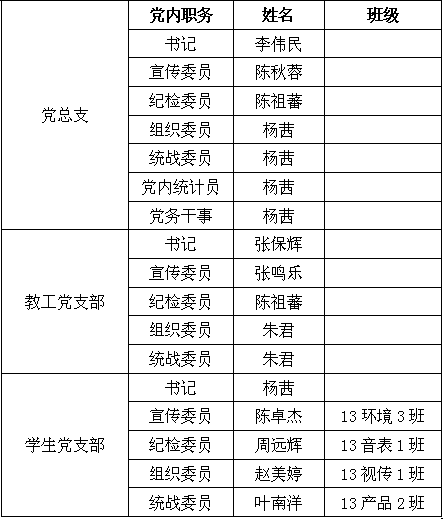 艺术公司现有教职工党员20名,员工党员31名。根据实际情况,我公司共分为一个教工党支部、一个员工党支部。艺术公司党总支委员会成员名单如下: