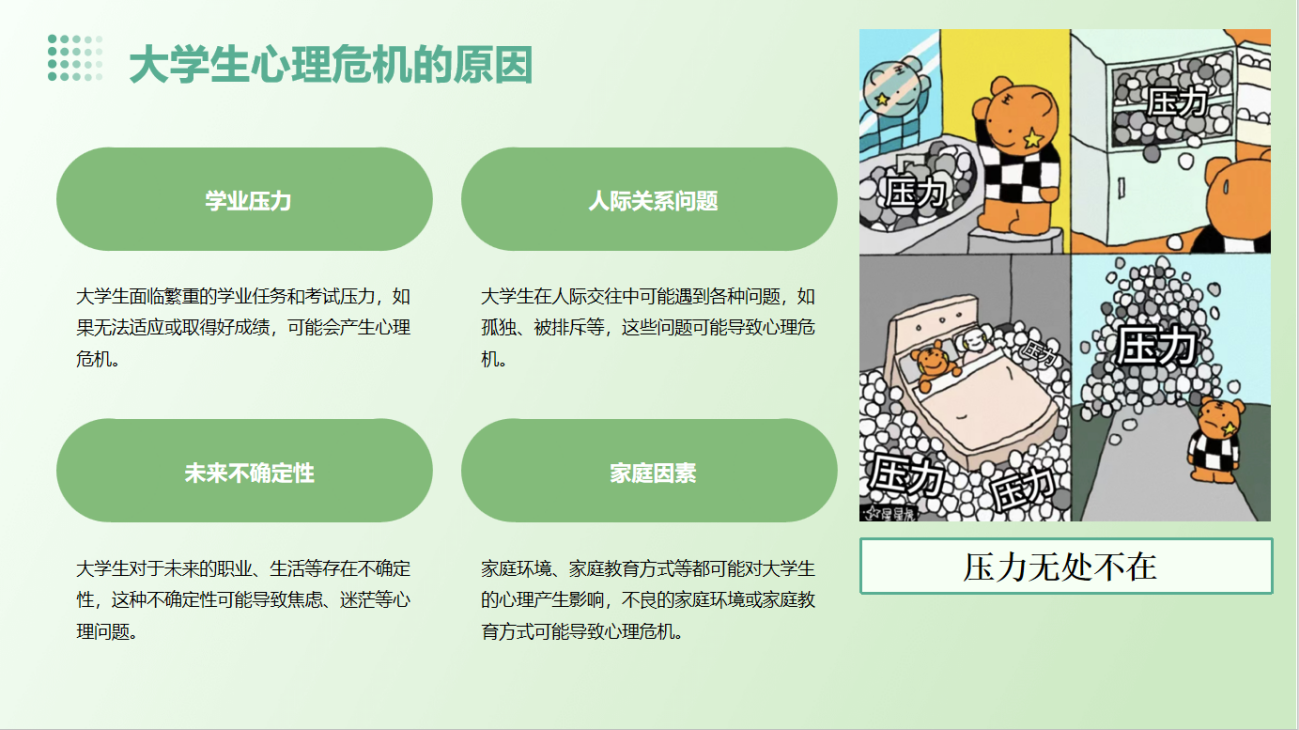 在详细介绍心理危机的突发性、严重性和普遍性等特点后,主持人还深入分析了可能导致老员工心理危机的多种原因,包括学业压力、人际关系问题、未来不确定性以及家庭因素等。同时,强调了心理危机干预在预防心理危机、促进老员工全面发展等方面的重要作用。