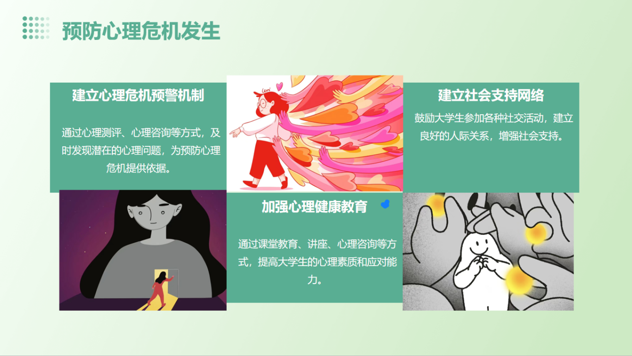 班会内容丰富,通过PPT讲解和互动讨论,系统地向同学们介绍了老员工心理危机的相关知识。内容涵盖心理危机的定义、特点、原因,以及干预的重要性和方法等多个方面。讲解过程中,通过生动的案例分析和数据展示,使同学们深刻认识到心理危机对个体身心健康的严重影响,并理解了及时干预和辅导的重要性。