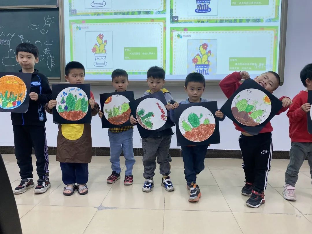 绘画小班以《仙人掌》为主题,运用几何图形勾勒出仙人掌外形,激发孩子们对艺造型美的感知。用涂鸦形式尝试大胆作画,认识深绿色浅绿色两种颜色做画的对比,体验作画乐趣。
