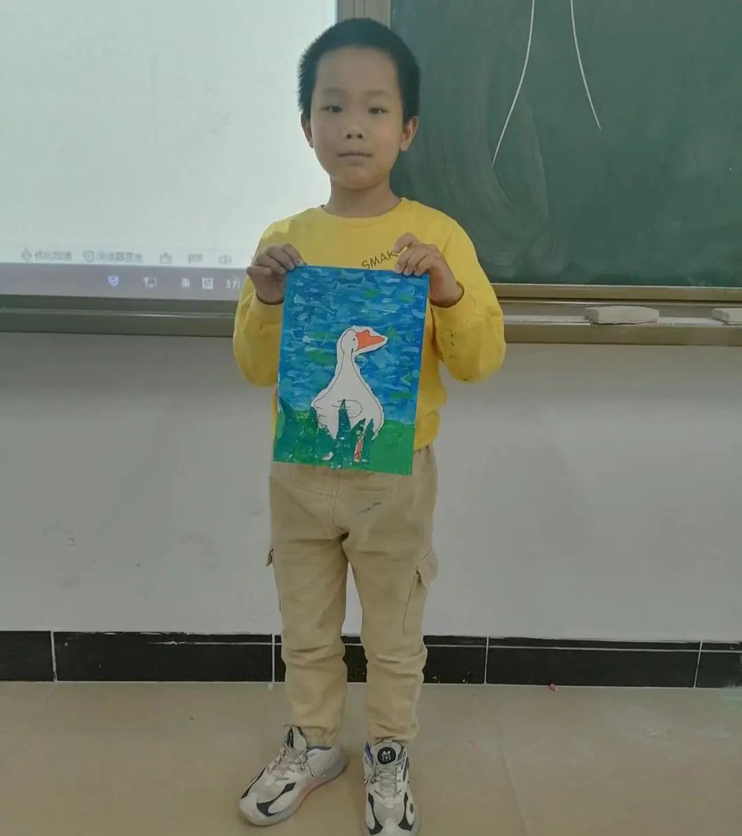 绘画大班以《草丛中的小鸭子》为主题,学习用半立体的方式,制作湖水背景和草丛肌理。湖水的波纹需要耐心地用点来表现波光粼粼,为大白鹅创造一个清新的湖面,绘画和剪贴的方式极大地锻炼员工的动手能力、培养画面空间的构图能力。