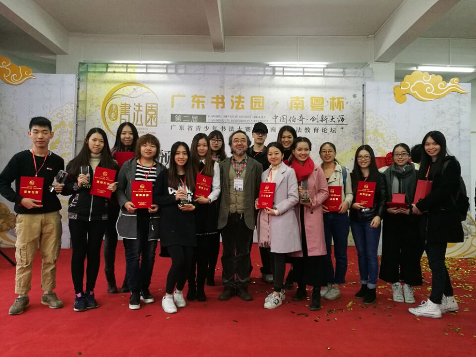 本次大赛是广东省书法专业展示规格较高,影响面较大的一个赛事,2014年第一届艺术公司书法专业作品参赛只有五位同学获奖。本次参赛由靳继君教授领衔带队指导,16位同学携作品参赛。经过广东省书法届权威专家的评阅和审定,公司书法专业李学文,潘振钊,潘婷婷,叶婷婷,吴金秀五位同学包揽了所有的一等奖;林佳颖、何景婷、曾玲、李倩、卢雅瑜同学获得二等奖;肖秋明、梁慧婷、梁嘉铭、范怡丽、古典同学获得了三等奖。所有参赛获奖占本次赛事青年组获奖总数的50%.