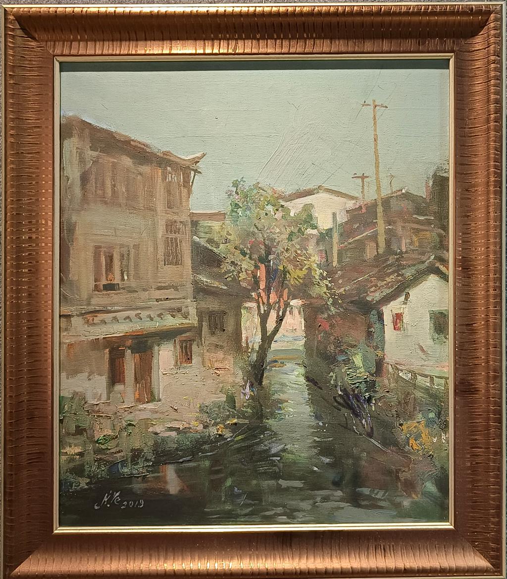 纪叶2——溪水小镇流 油画