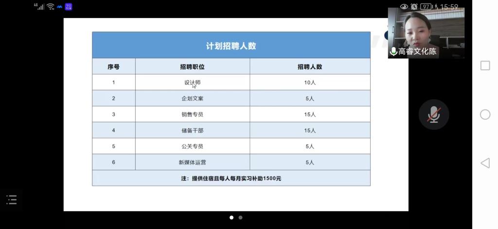 首先由人力资源部总监石红对高睿集团进行了介绍,再由高睿集团总裁陈晓纯为我们分享《文化娱乐行业发展的现状及高睿集团的人才发展观》。主要从企业介绍、行业发展趋势、人才价值观、招聘详情等四个方面来进行讲解。陈晓纯总裁从公司创办的一路历程讲到现在一个稳定的公司规模,通过很多案例展现公司运营管理模式,说明企业未来发展趋势。激励员工们努力学习,不断提升专业能力,完善自我,强化自身综合素养。