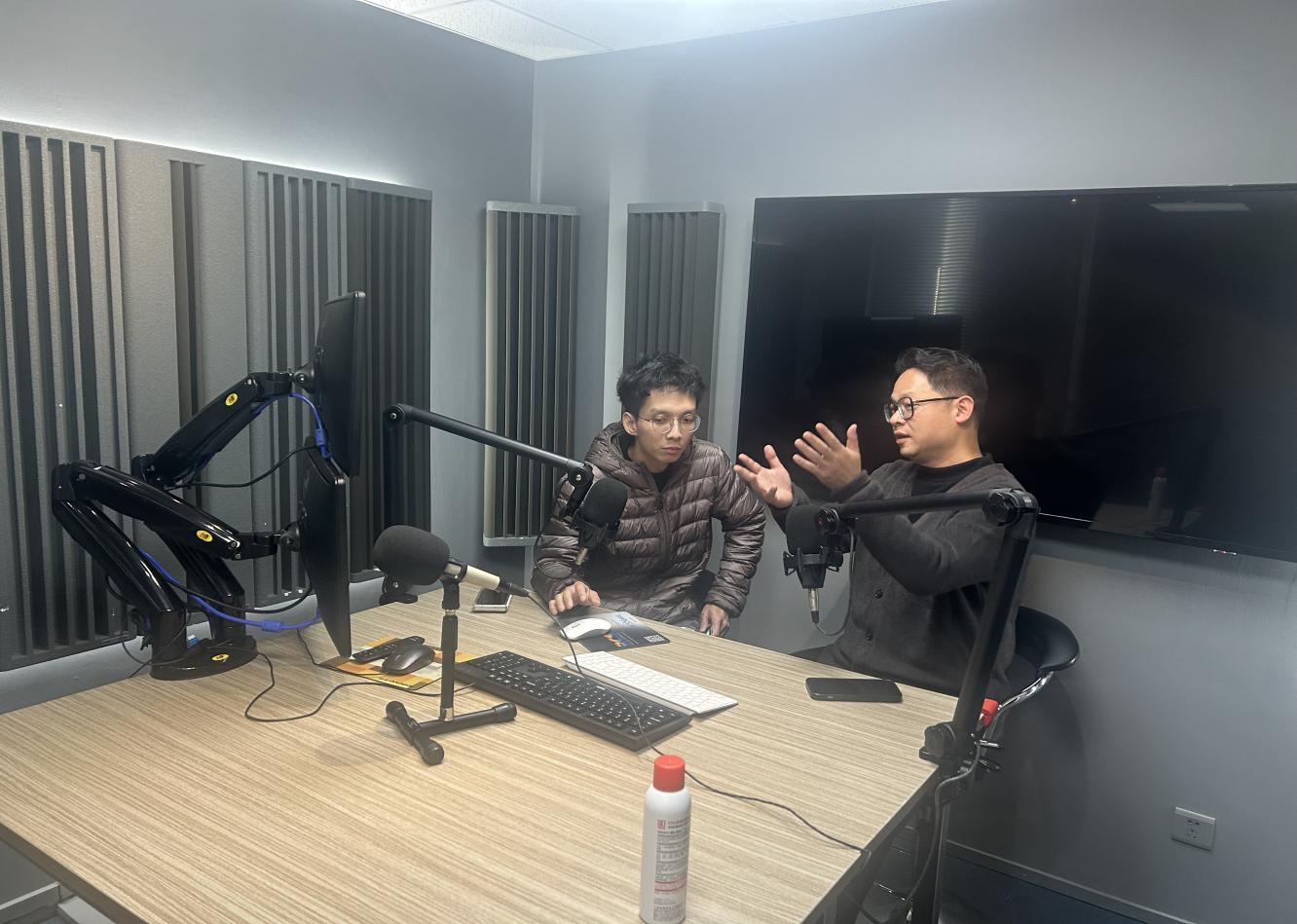 范天泽老师与广东广播电视台音乐之声融媒部主任林伟栋于录音室进行深入探讨
