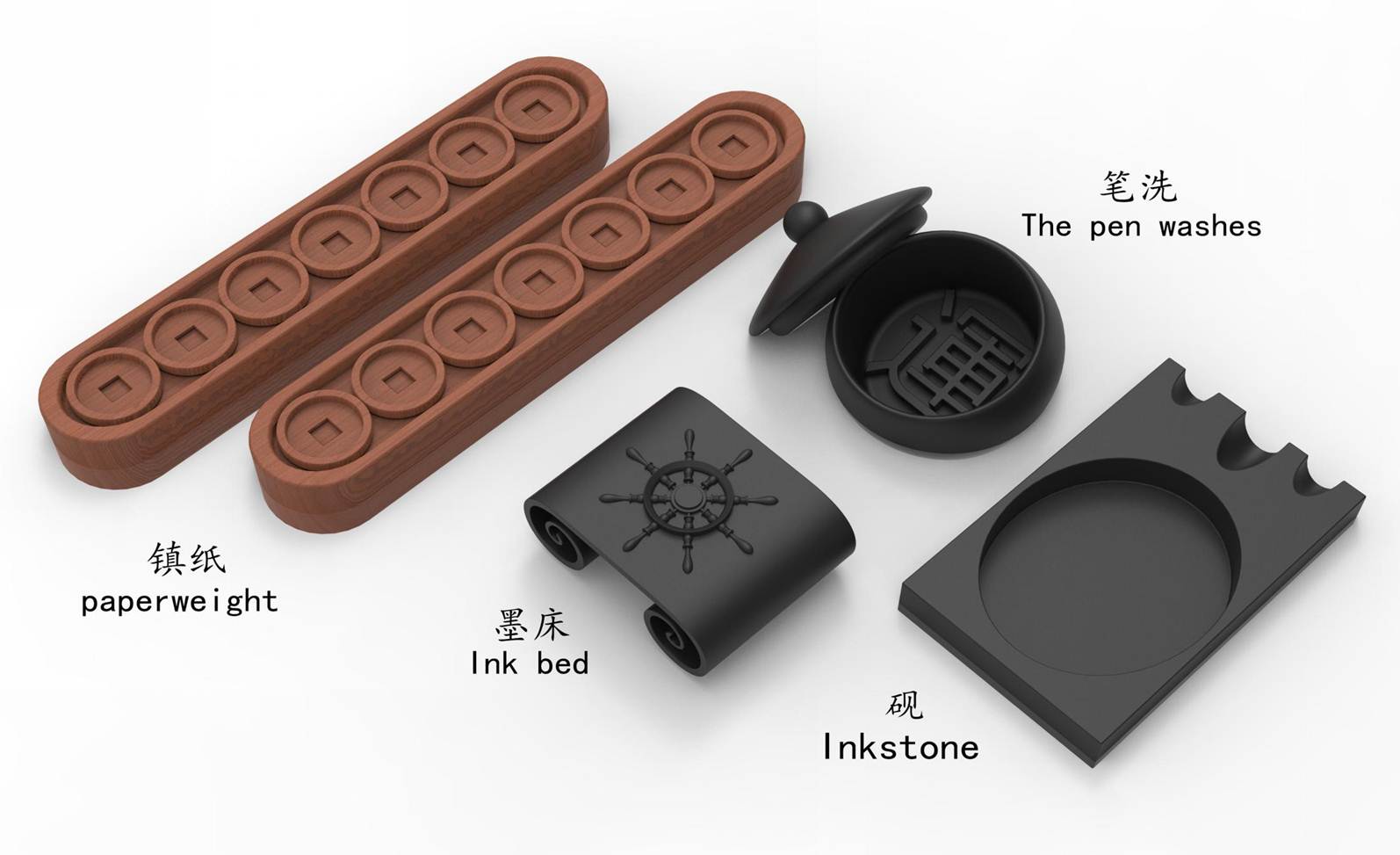大运河文化书法用具是为书法家、书法专业者、爱好者设计的文具套装,适用于:书法练习、精品收藏、学习鉴赏等场合,产品风格的设计风格为简约高端大气、具有书香意气。此套产品由砚、镇纸、笔洗、笔筒、笔架、墨床组成。