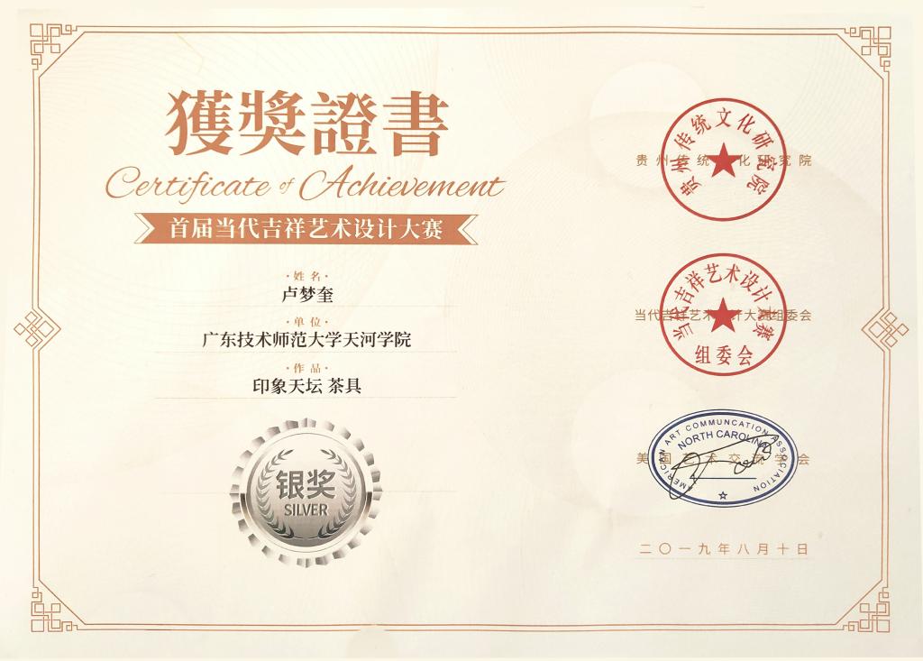 2019年9月,在首届当代吉祥艺术设计大赛中,在李林老师指导下,公司bevictor伟德产品设计专业16级员工卢梦奎的作品《印象天坛茶具》和《大运河文化书法用具》分获银奖和铜奖。