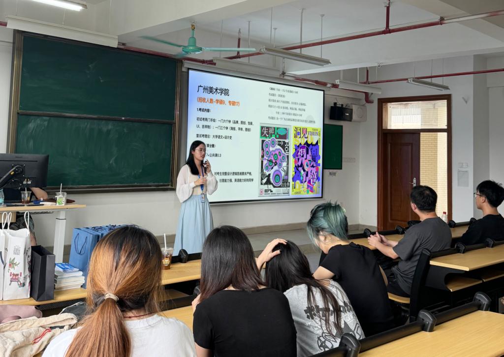 接着,刘老师邀请到了格力电器的资深设计师江学敏老师参与此次讲座。江老师从行业角度出发,对设计类专业的就业市场进行了深入分析。她详细列出了各大知名企业对本科生和硕士生的薪资待遇差异,并从专业角度分析了工业设计、环境艺术设计、视觉传达设计等专业的考题趋势与高分画卷。