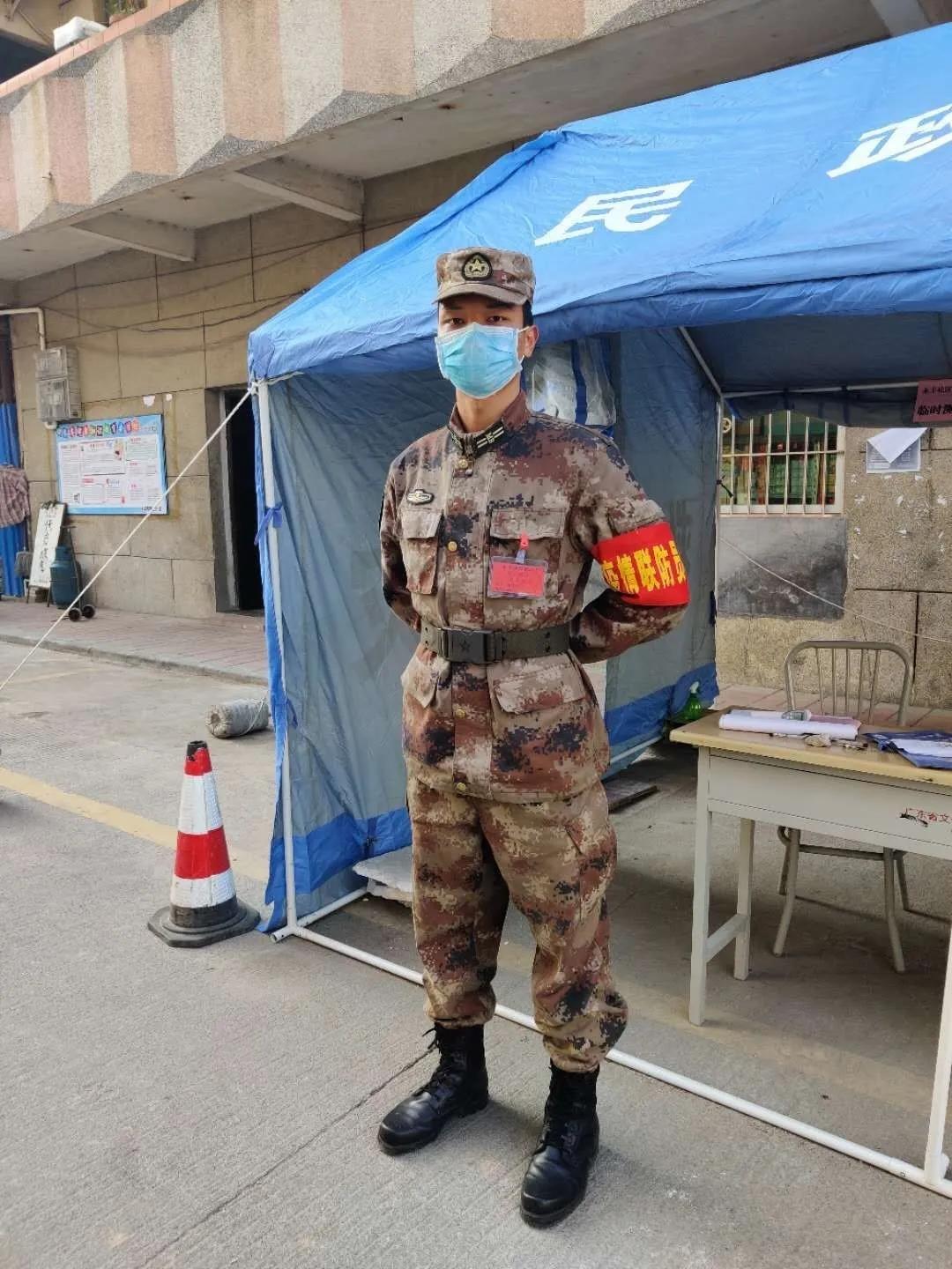 19音表班何贤锐同学是名退役军人,入党积极分子,校国旗护卫队队员。疫情就是命令,防控就是责任。根据肇庆市军分区及德庆县人民武装部的号召,他积极参加由武装部组织的退役军人防疫应急队,从2月10日起执行辖区永丰街道疫情防控任务,直至疫情结束,做到战“疫”不胜,不收兵。主要负责领导岗位志愿者防疫检测登记工作及维护现场人员稳定。他表示:“疫情何时结束我未曾知道,但我坚信疫情结束以后,你我一切都好。没有不可逾越的寒冬,没有不可战胜的病魔,乌云永远遮蔽不了太阳,疫情挡不住春天的来临。不忘初心,牢记使命,用实践行动坚决做到退伍不褪色,若有战,召必回的退伍誓言”!