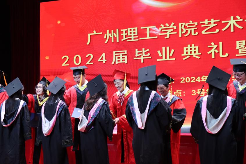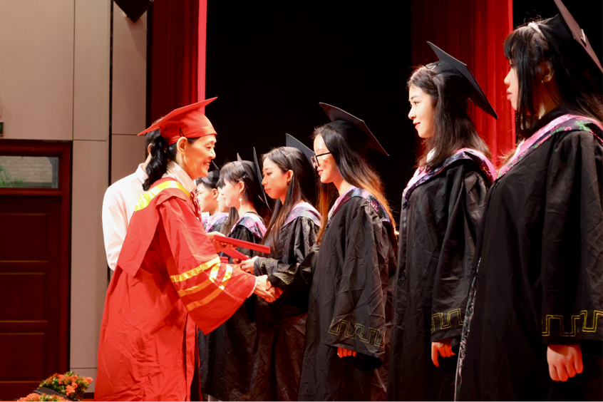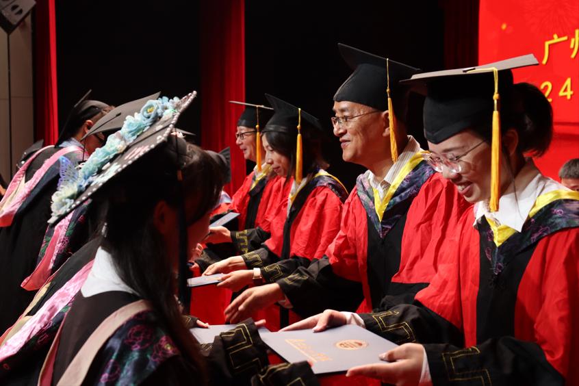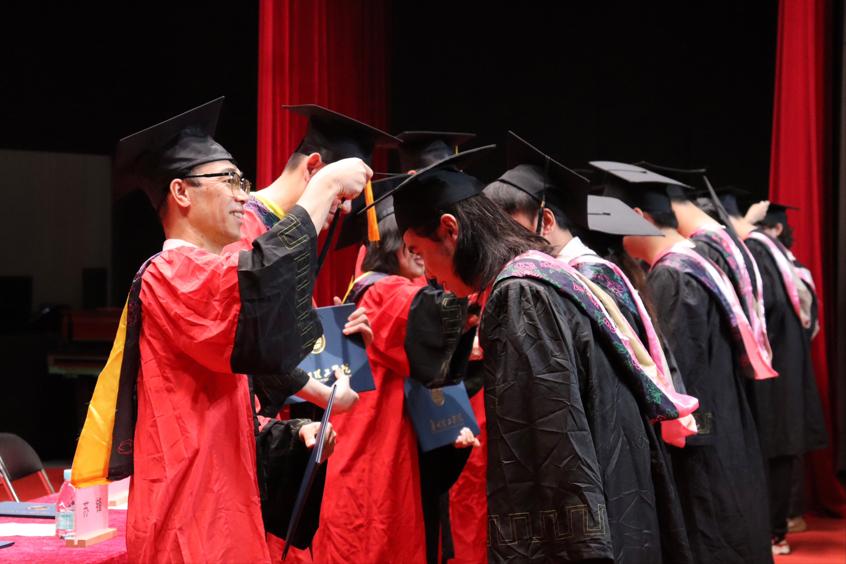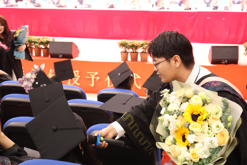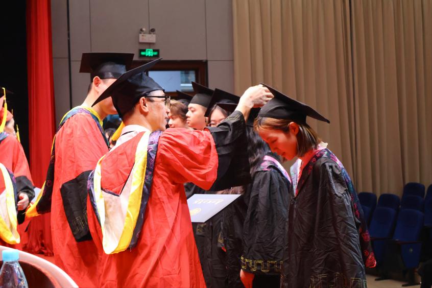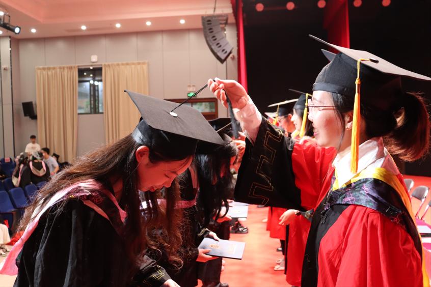 在领导、老师和现场家长的见证下,2024届毕业生们分组上台完成拨穗正冠授位仪式。