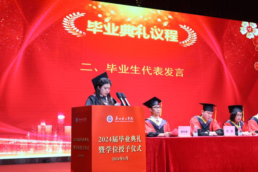 优秀毕业生代表20环境1班叶雅怡发言,在这里她度过了人生最难忘的时光。公司不仅注重专业知识的传授,更重视对员工艺术素养的培养,经常组织各种艺术展览和活动,还邀请业内专家对我们传授经验进行指导,这些活动让她有了机会接触到最前沿的设计理念。最后她祝贺同学们,无论未来遇到多少困难和挑战,都要保持坚定的信念和勇气,不断追求自己的梦想。