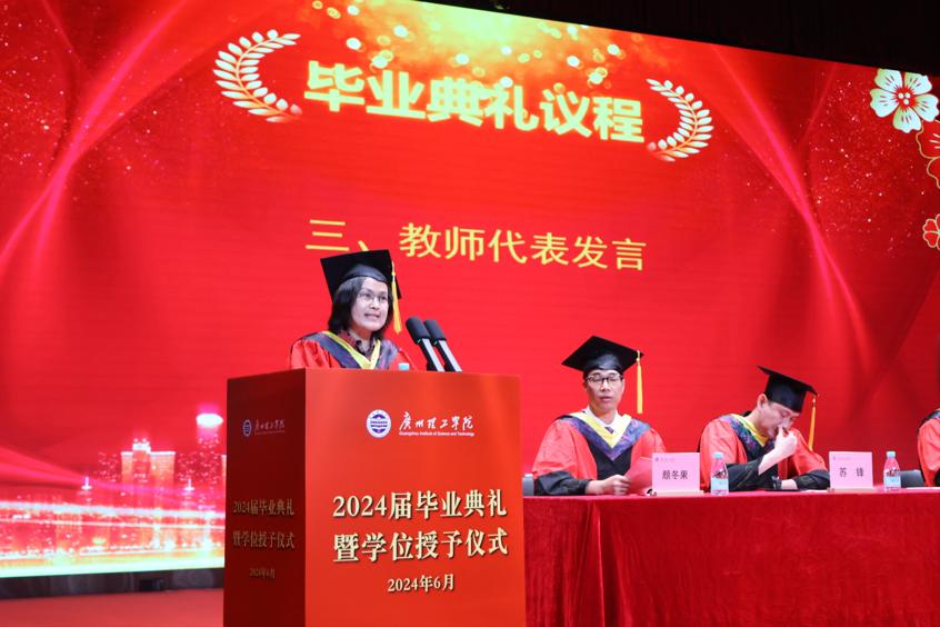 教师代表段碧丽发言,首先她祝贺同学们学业顺利毕业,然后为即将走出校门的学子送上诚挚的建议,一、不忘初心。二、学会感恩珍惜缘分。三、敢于担当服务社会。四、不断学习永无止境。最后祝愿毕业生在未来的日子里,创造出属于自己的辉煌和事业,为自己、家人、社会和国家做出伟大贡献。