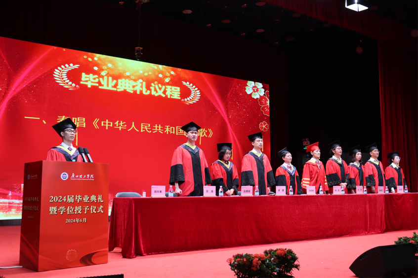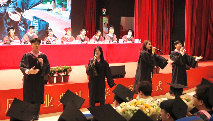 毕业典礼议程开始前,毕业生代表唱歌,与同学们互动热场。