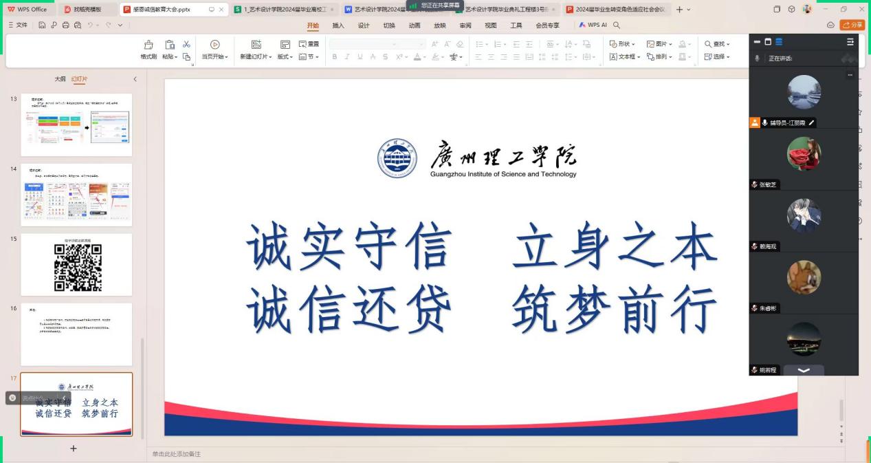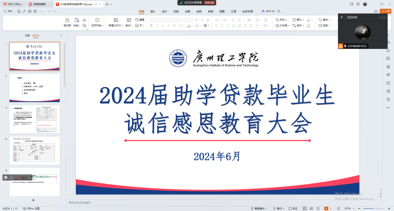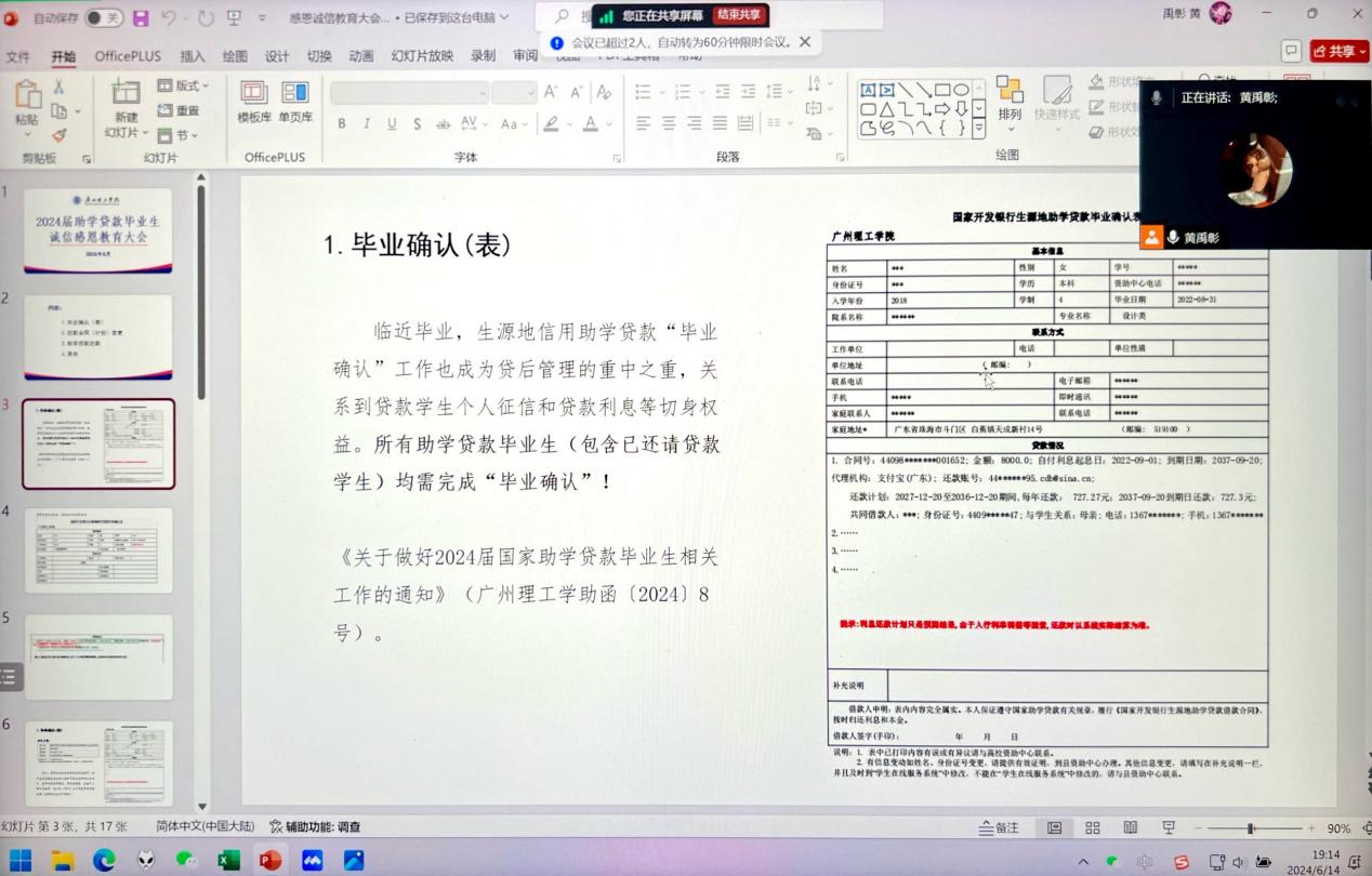 (黄禹彰)为加强公司员工诚信感恩教育,让员工了解征信体系及还贷相关知识,树立诚信还贷意识。2024年6月14日晚上,20级毕业生级在腾讯会议开展2024届助学贷款毕业生诚信感恩教育大会,会议由各班辅导员及班长主持。