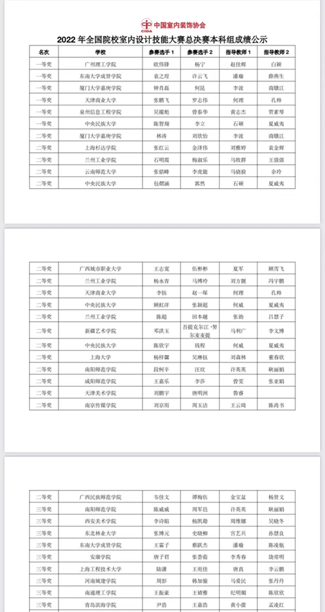 2023年3月26日,中国室内装饰协会主办、教育部职业院校艺术设计类专业教学指导委员会支持,北京电子科技职业公司承办的2022全国院校室内设计技能大赛全国总决赛圆满收官。历时4个多月,来自全国600余所院校的1200多支参赛队伍,经历层层选拔和激烈角逐,共计160余支参赛队入围总决赛。在公平、公正、公开、透明的原则下,根据专家评比,公司赵佳辉、白颖老师指导的员工取得一等奖一项、三等奖两项的优异成绩。