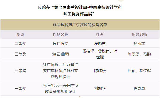 5月9日,第七届“米兰设计周-中国高校设计学科师生优秀作品展”非命题赛道广东赛区拟获奖名单公布,经过5天公示,公司杨雨霏、陈恩恩、冯勤、白颖、赵佳辉老师指导的六位员工庄晓慧、伍桂坪、曾锐伟、叶世源、陈炜松、刘婉华取得了本科生研究生组二等奖1项、三等奖3项的荣誉。