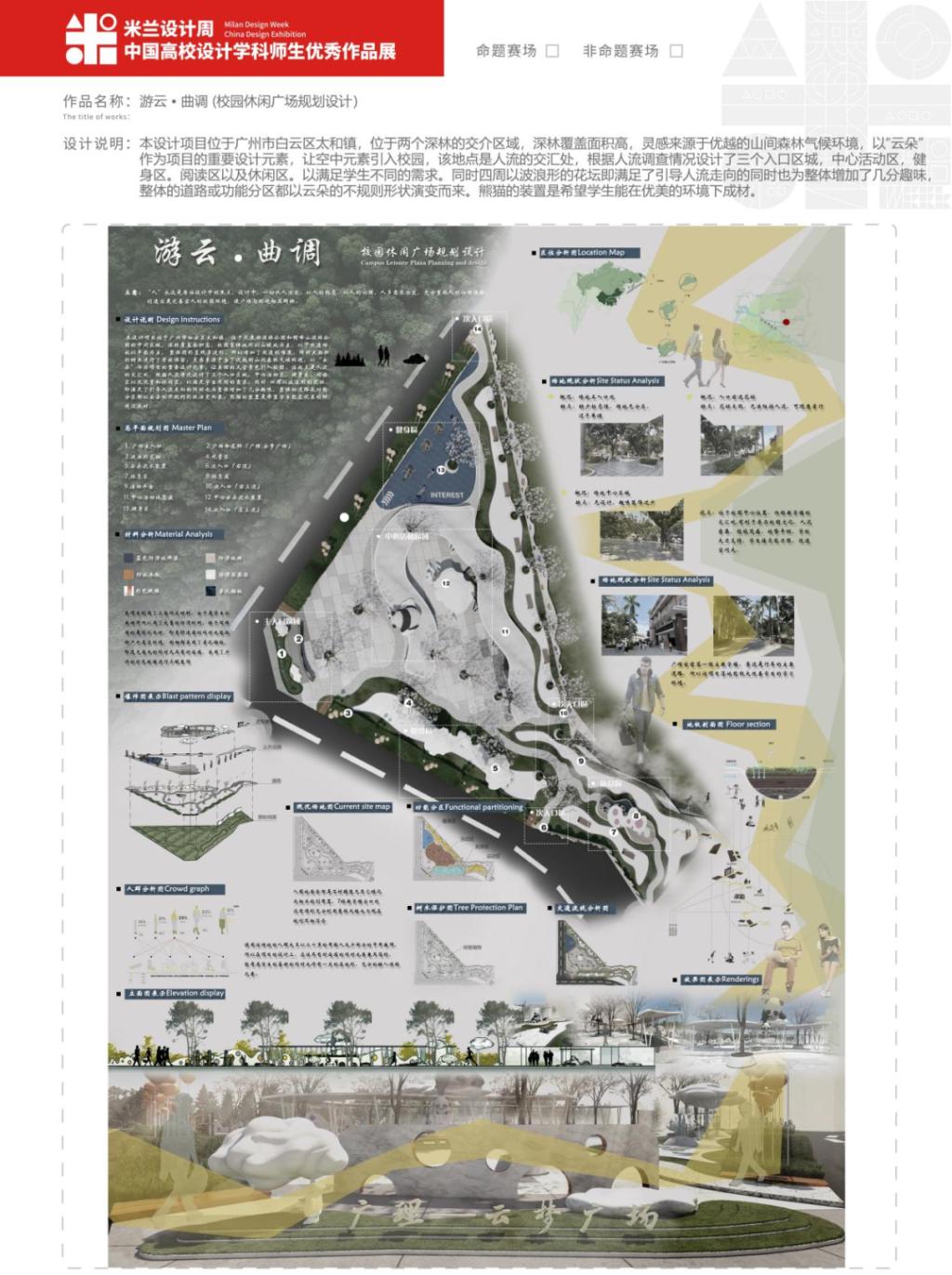 伍桂坪、曾锐伟、叶世源作品《游云·曲调》校园广场设计,使用切割交错的设计手法,将云朵及国宝元素贯穿于整个项目中,营造出富有生趣的校园景观。将基础的服务型设施和观赏性设施结合在一起,用以人为本的理念,来烘托校园活力的空间氛围。