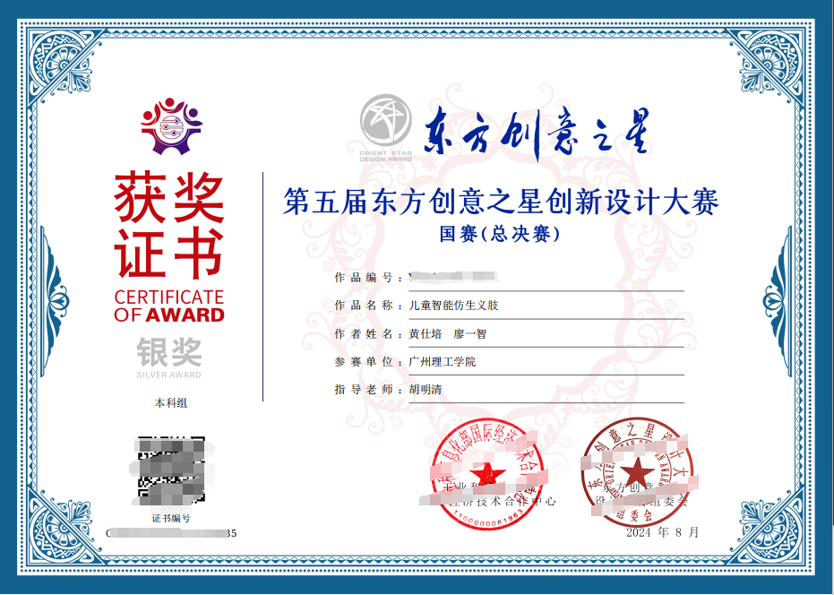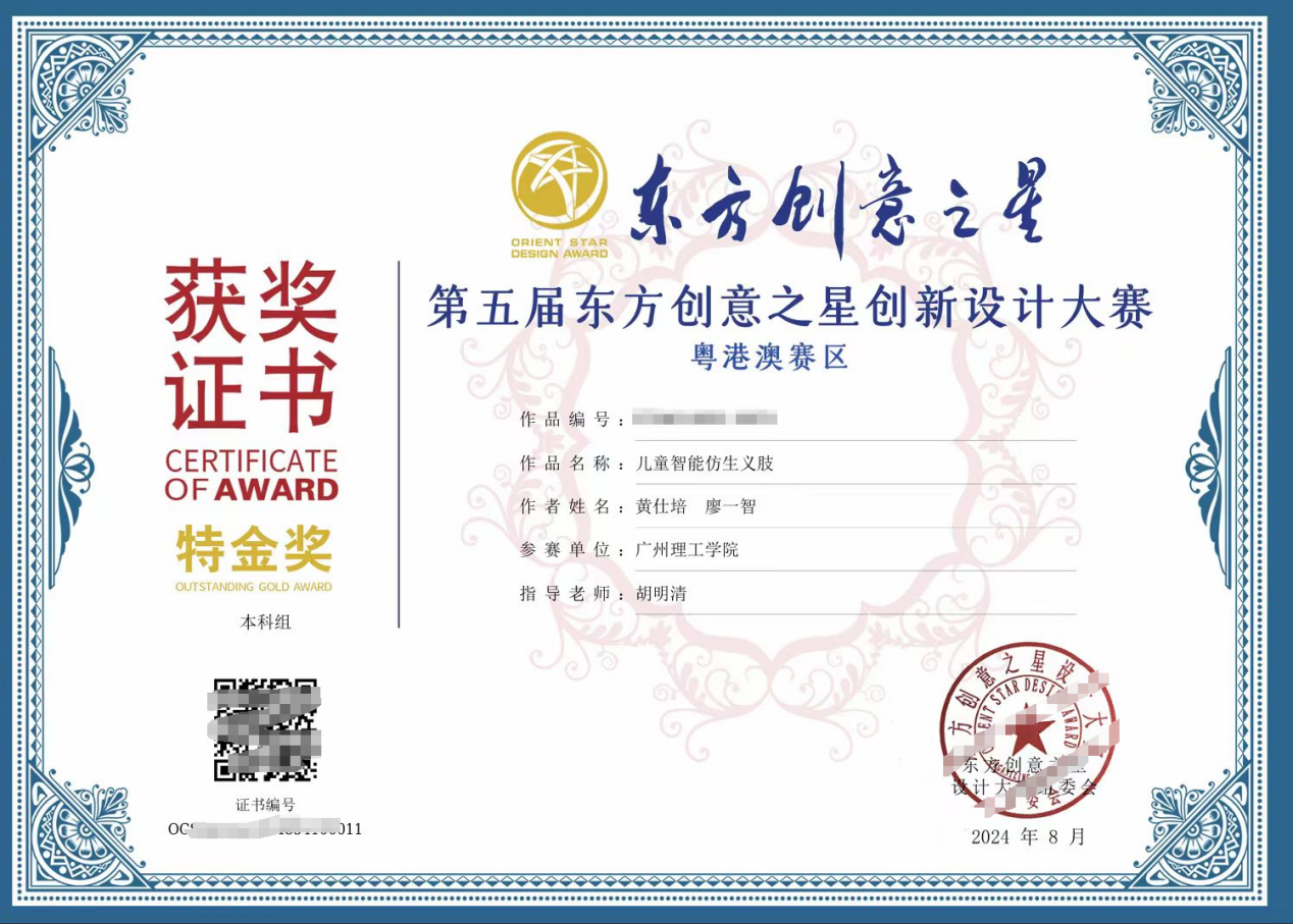 (胡明清)2024年第五届东方创意之星创新设计大赛圆满落幕,本次大赛是由工业和信息化部国际经济技术合作中心批复举办的工业设计领域学科竞赛,分为创新设计大赛(员工赛)、教师教学创新大赛(教师赛)和工业设计大赛(中俄工业创新大赛专项赛)三条赛道。经过激烈角逐,公司学子黄仕培在此次大赛中脱颖而出,斩获了令人瞩目的荣誉,参赛作品“儿童智能仿生义肢”获第五届东方创意之星创新设计大赛广东省赛一等奖和国赛(总决赛)二等奖、参赛作品“智慧农业挂轨监测与喷酒系统”获第五届东方创意之星创新设计大赛广东省赛金奖、参赛作品“智能采摘机器人”获第五届东方创意之星创新设计大赛广东省赛金奖。