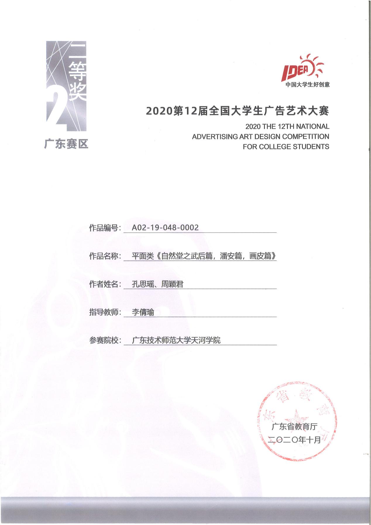 本届大广赛正值疫情期间,孔思瑶同学与周颖君同学克服居家创作、接受指导老师远程辅导等诸多困难,斩获夺省级两项大奖,展现了难得的竞赛风采。