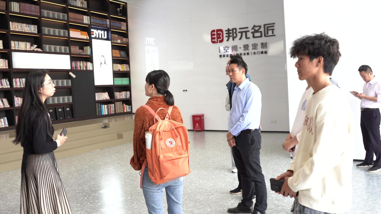 拍摄工作结束后,佛山驻镇工作队队长、镇委副书记陈启浩的带领下,6名师生代表前往四会电子信息产业园的广东肇庆福美装饰材料有限公司进行走访与调研学习。在工作人员的带领下,员工通过了解智能制造自动化生产车间运作过程及特殊工艺的研发的生产过程。走访企业办公区,近距离了解公司职员的日常工作内容及目前企业人才需求。