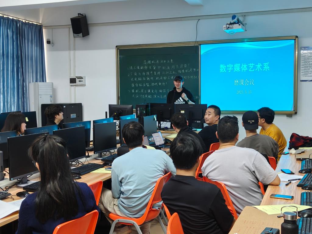 (苏锋)3月14日下午,为了保证系部教学质量的稳步发展,数字媒体艺术系在7-116机房进行2025年新学期的第一轮磨课会议,会议的主旨是帮助老师们特别是新入职的年轻教师尽快步入正常教学轨道,积累教学经验,会议由数字媒体系主任苏锋老师主持,数字媒体艺术系全体教师参与了磨课会议。